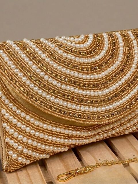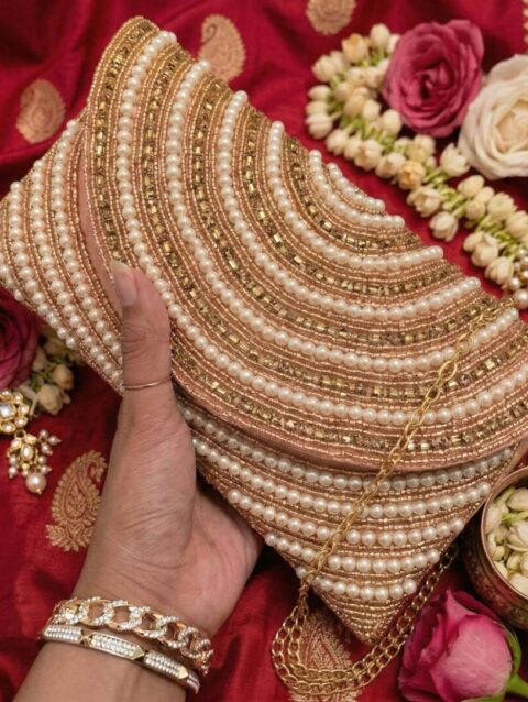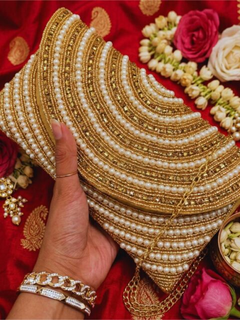 KVIN IXIA : Gold Hand-Embroidered Bridal Pearl Clutch