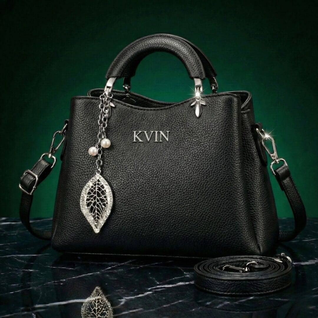 Discover effortless elegance with this compact black tote. Featuring a durable pebbled leather texture (PU), gleaming silver-tone hardware, and a stunning silver leaf and pearl charm, this bag is a chic companion for both business and evening outings. Includes a detachable shoulder strap for crossbody wear.