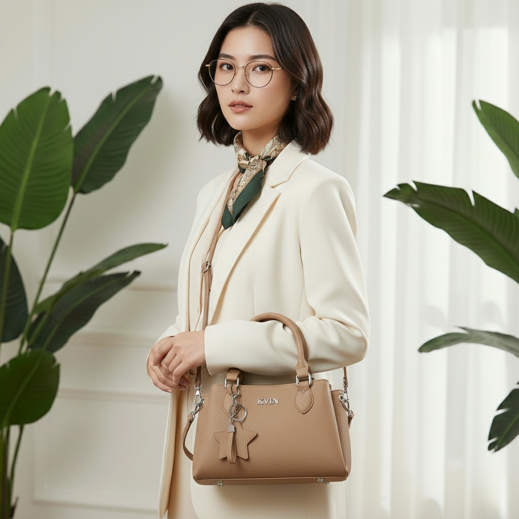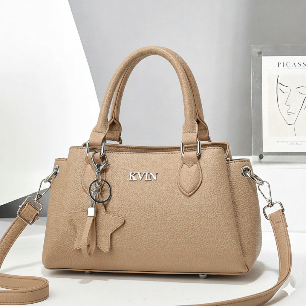Embrace timeless versatility with the Elite-Charm Signature Satchel in Toasted Almond. This “soft-structured” masterpiece features a premium lichee-patterned finish, accented by the iconic KVIN silver-metallic logo. Designed for the modern woman who values a neutral, high-end aesthetic, it transitions effortlessly from a professional hand-carry tote to a relaxed crossbody, making it the perfect companion for every season.