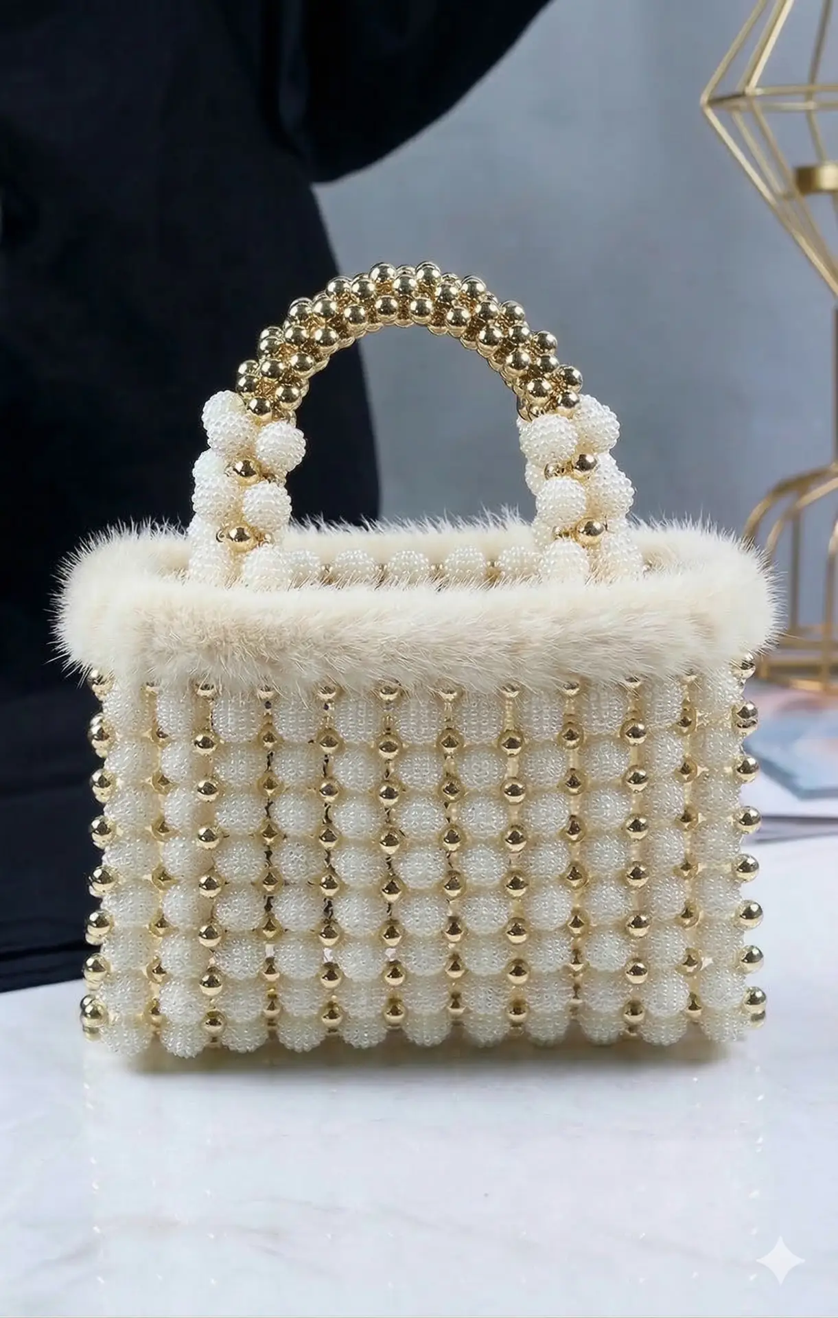 Step into the future of fashion with the KVIN EXIA, a high-impact mini tote that blends architectural structure with soft luxury. Featuring a stunning grid of ivory pearls and polished gold beads, topped with a plush faux-fur trim, this handcrafted statement bag is the ultimate accessory for high-fashion events and winter galas.