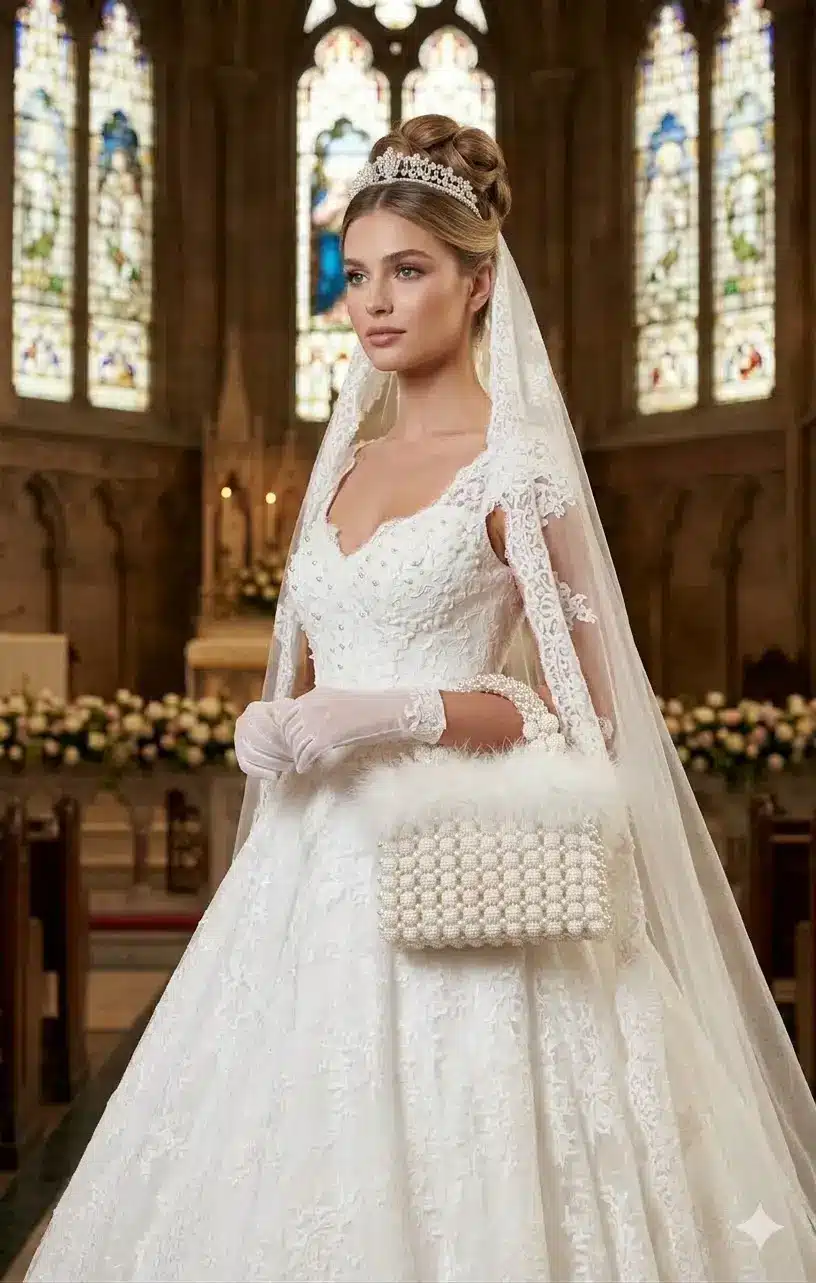 • Monochromatic Luxury: A stunning all-white palette featuring high-luster pearls and matching feathers.