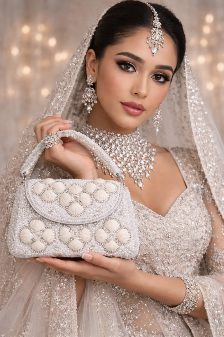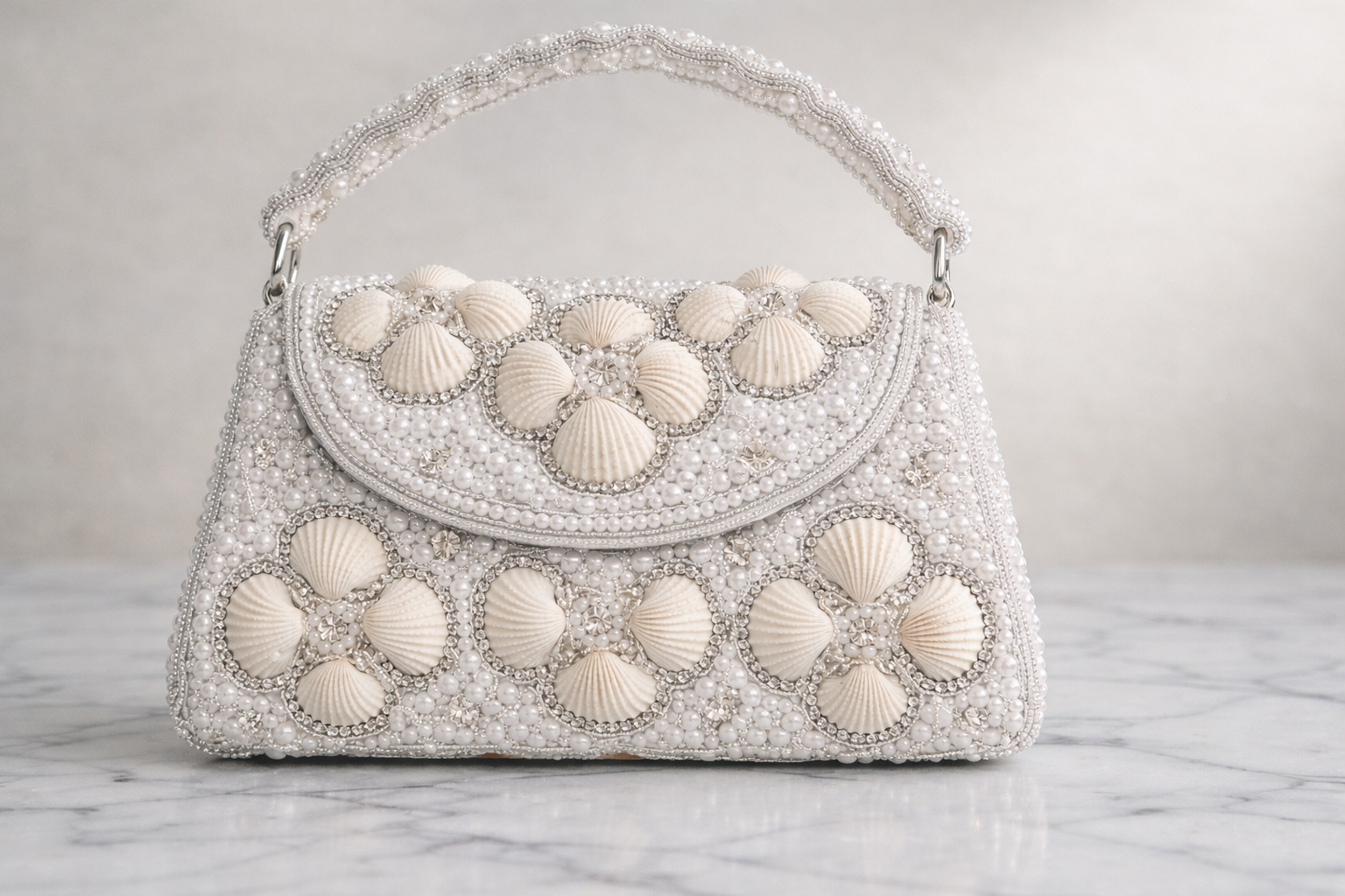 The KVIN OLYN Pearl White edition is a masterpiece of monochromatic elegance. This artisanal handbag elevates high-fashion accessories to an art form, featuring a dense field of hand-stitched ivory pearls that serve as the canvas for its signature seashell-flower designs. Each floral cluster is crafted from natural-textured shell elements, bordered by shimmering silver-tone crystals for a brilliant, dewy finish.