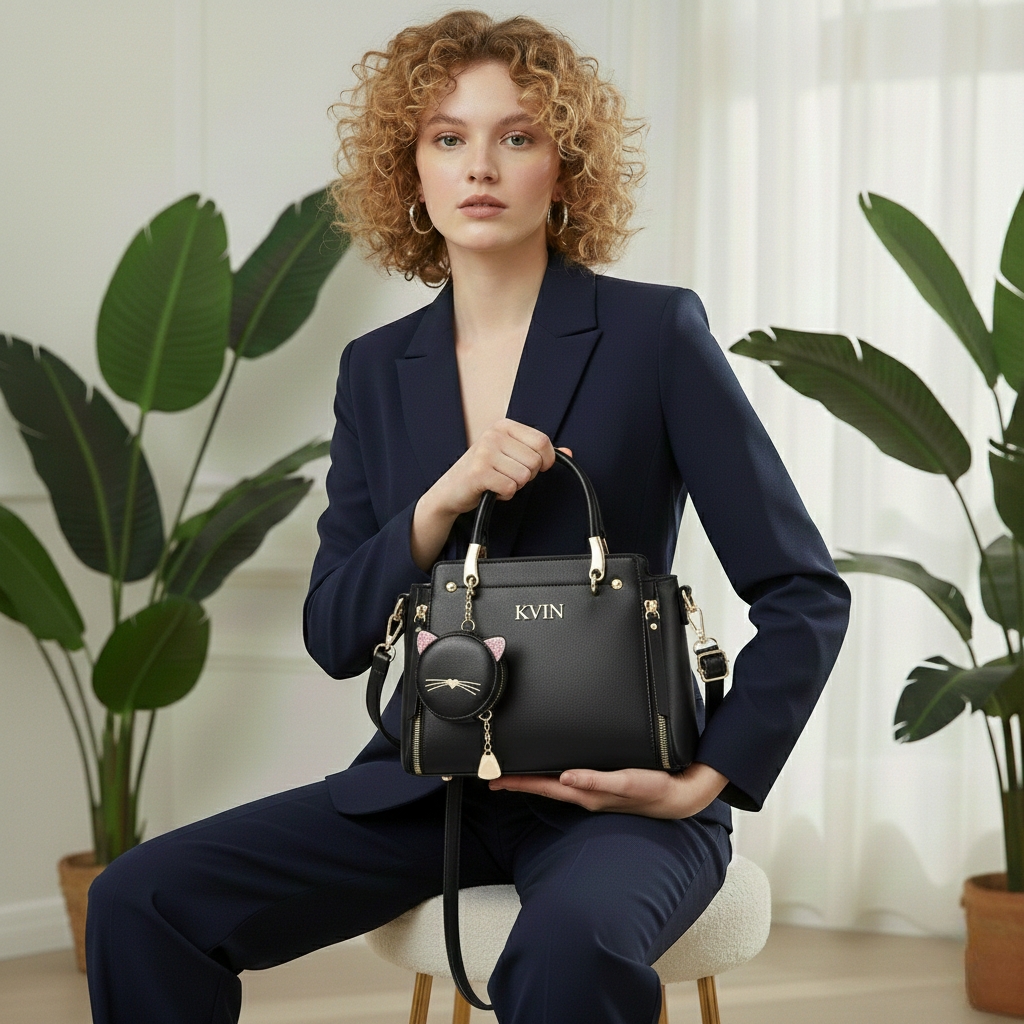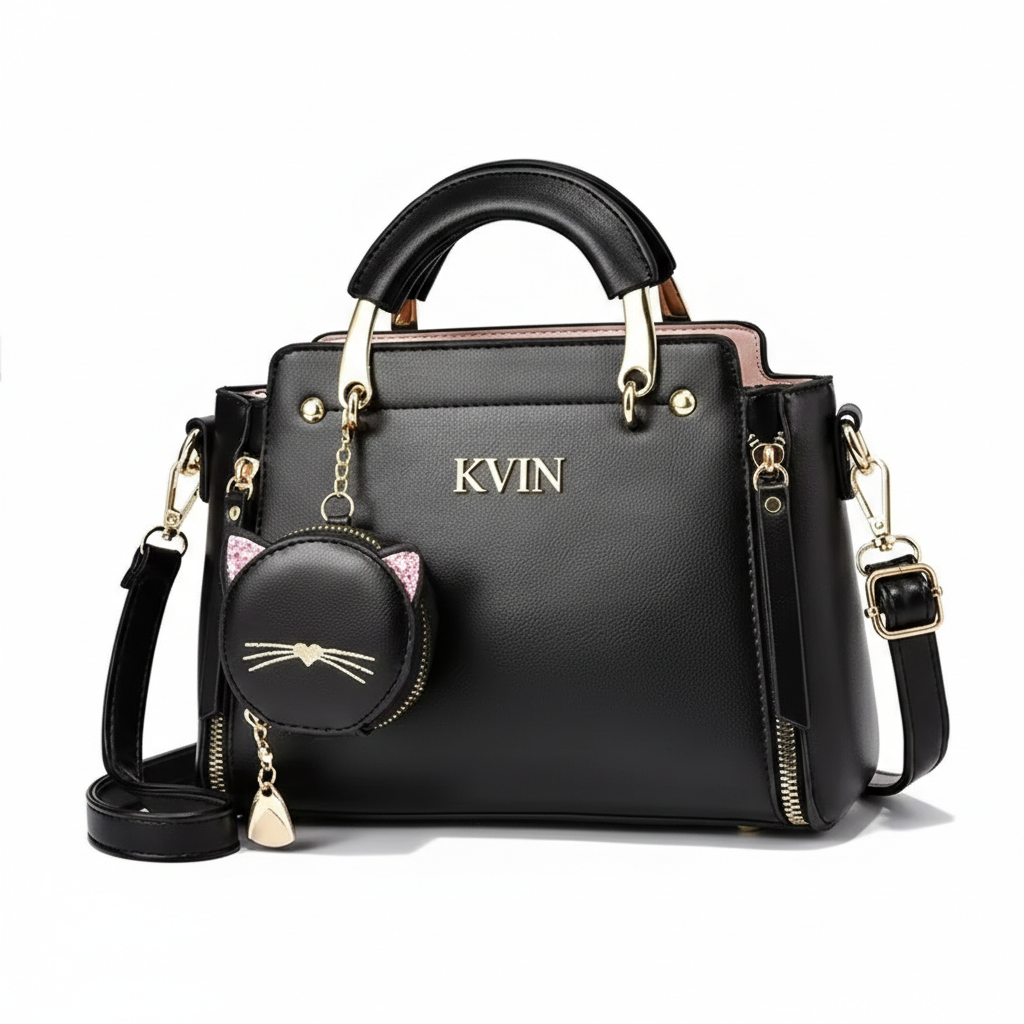 The KVIN RHEA in Midnight Black is the ultimate versatile staple. Combining a classic, structured silhouette with a playful cat-themed charm, this premium PU leather tote offers a high-contrast look with polished gold-tone hardware for the modern trendsetter.