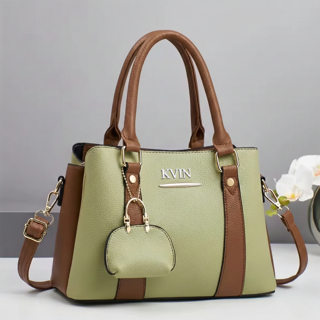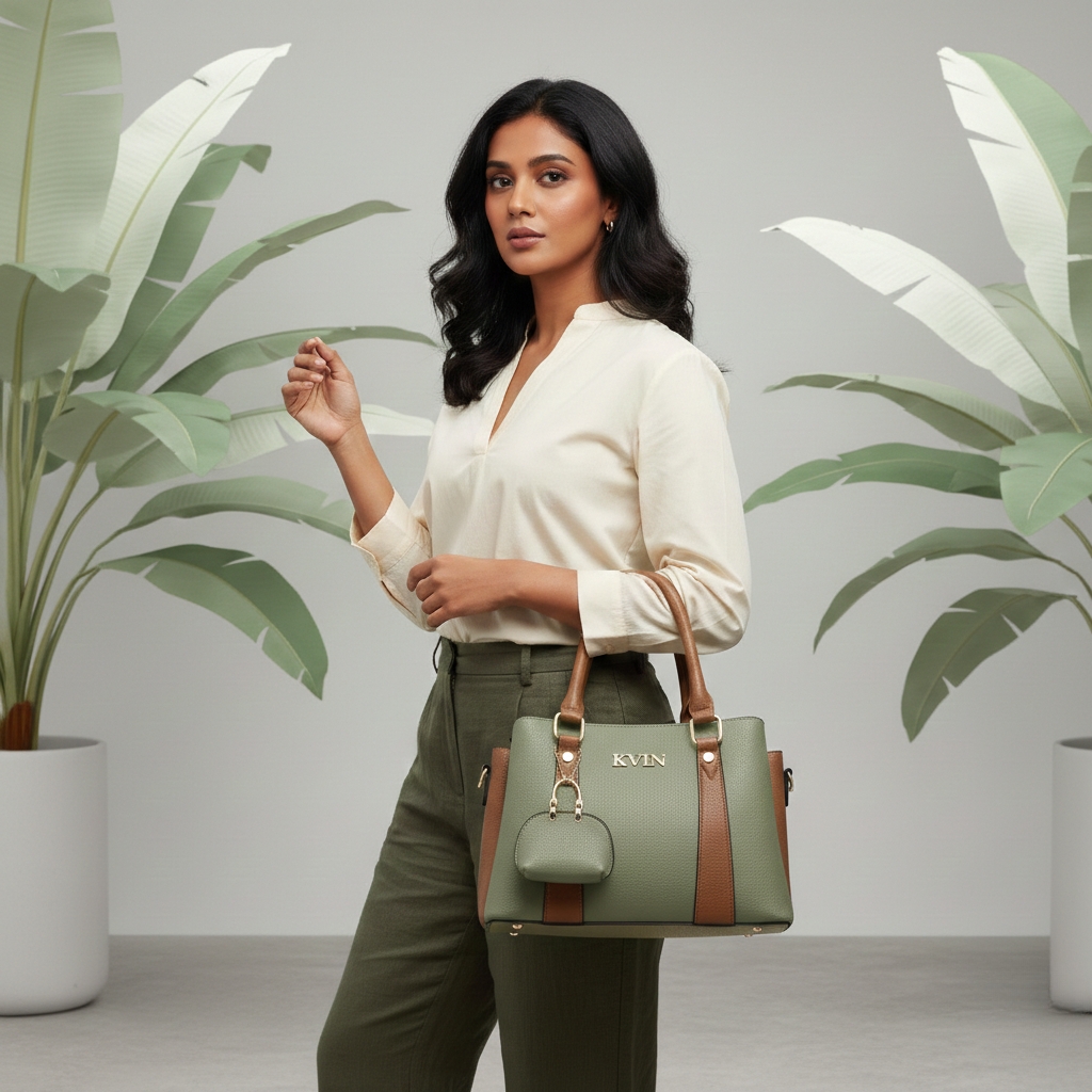 Refresh your look with the KVIN VELLA Sage Mist & Toasted Earth Satchel. A perfect fusion of “Urban Simplicity” and practical luxury, this large-capacity handbag features a soothing green-and-brown color-block palette designed for the modern woman on the move.