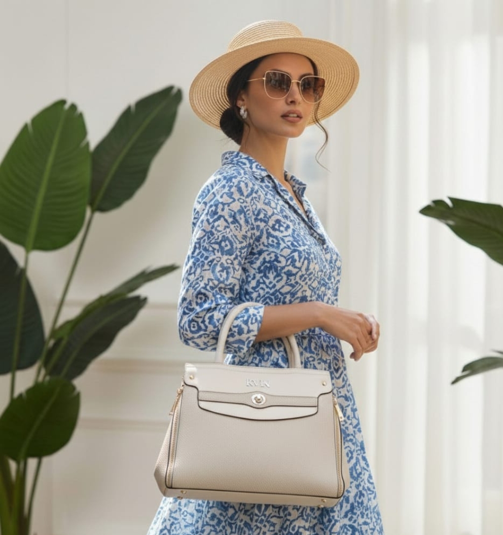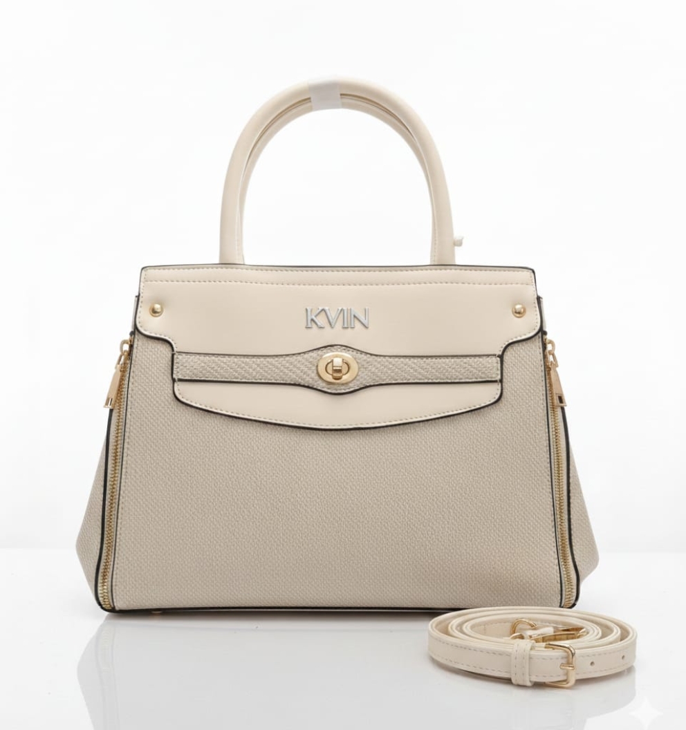Define your style with the KVIN VEDA, a minimalist yet luxurious off-white satchel. Featuring a sophisticated textured panel and gold-tone accents, this versatile bag offers a premium look with the practical space needed for your daily essentials.